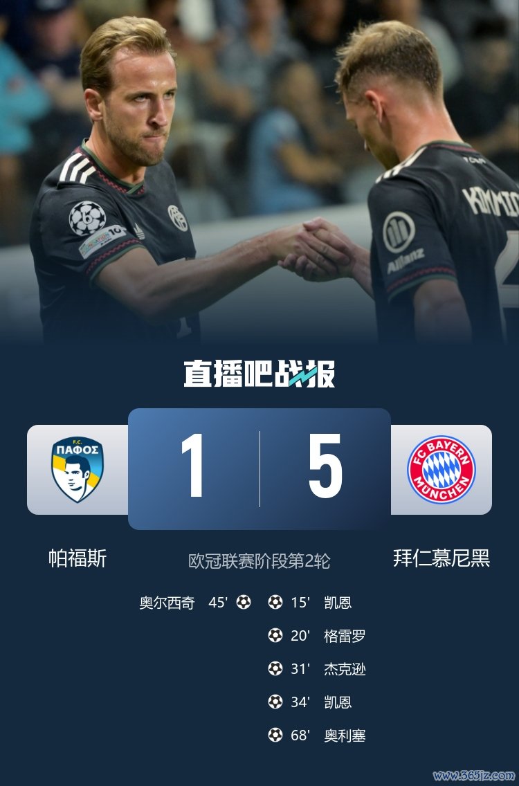 欧冠联赛阶段第2轮,拜仁5-1大捷帕福斯。凯恩梅开二度,新赛季各赛事9场17球3助。