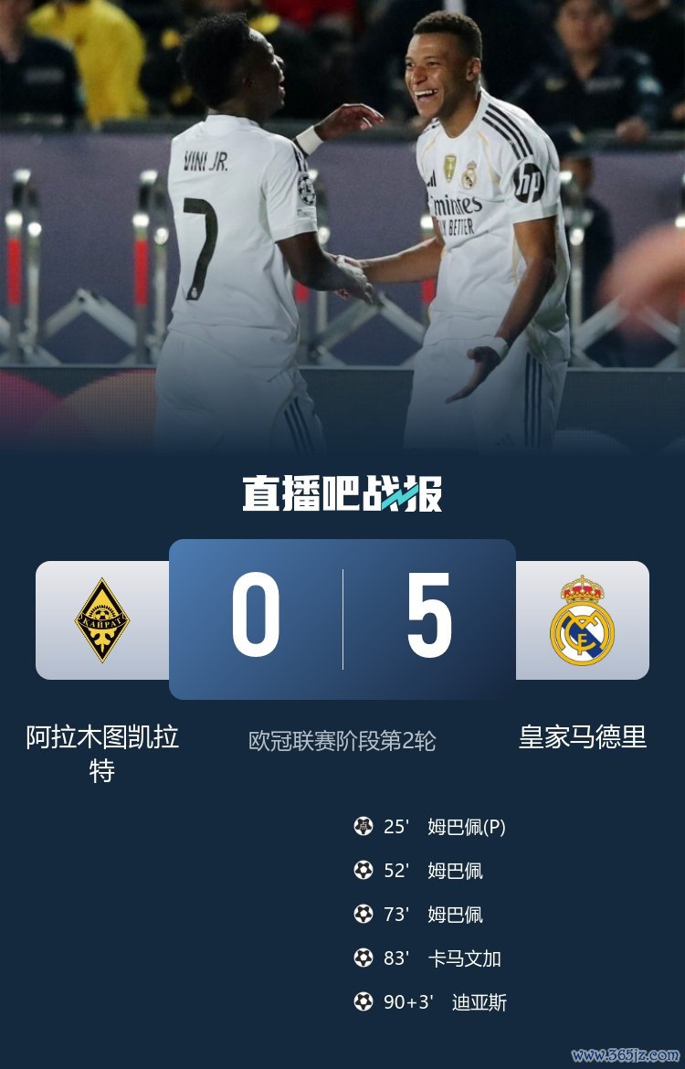 皇马客场远征大捷;姆巴佩帽子戏法,罗德里戈1助1蓄意,卡马文加、迪亚斯立功,库尔图瓦、居勒尔助攻。