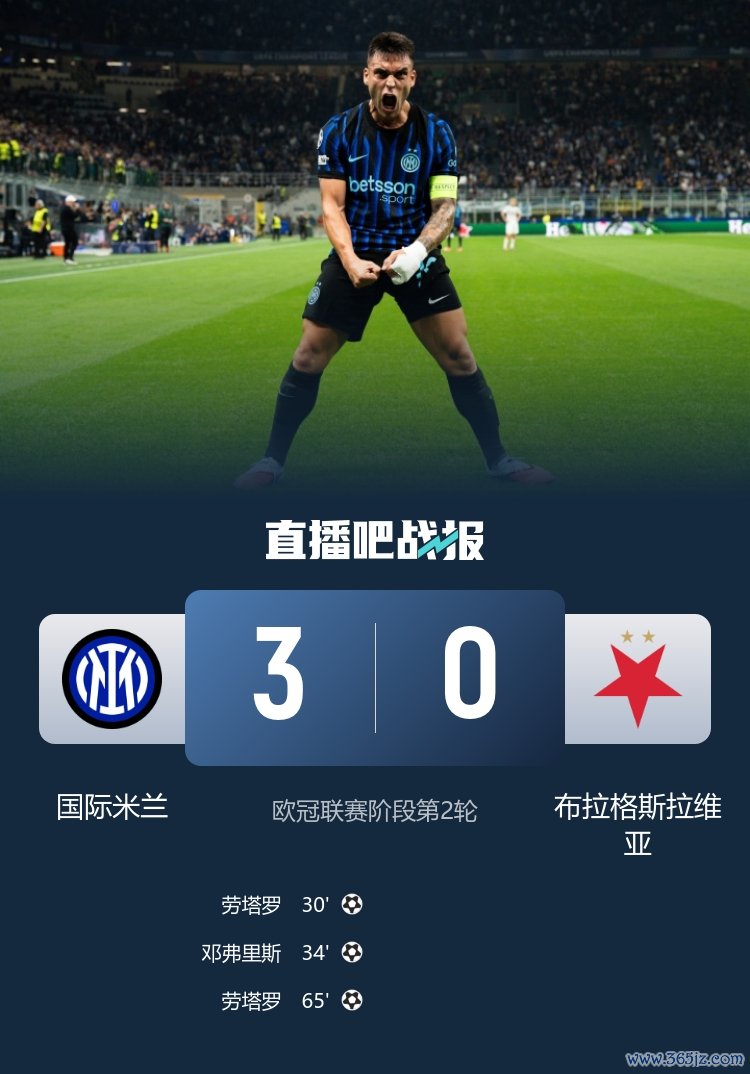 国米3-0布拉格斯拉维亚欧冠两连胜 劳塔罗双响邓弗里斯立功