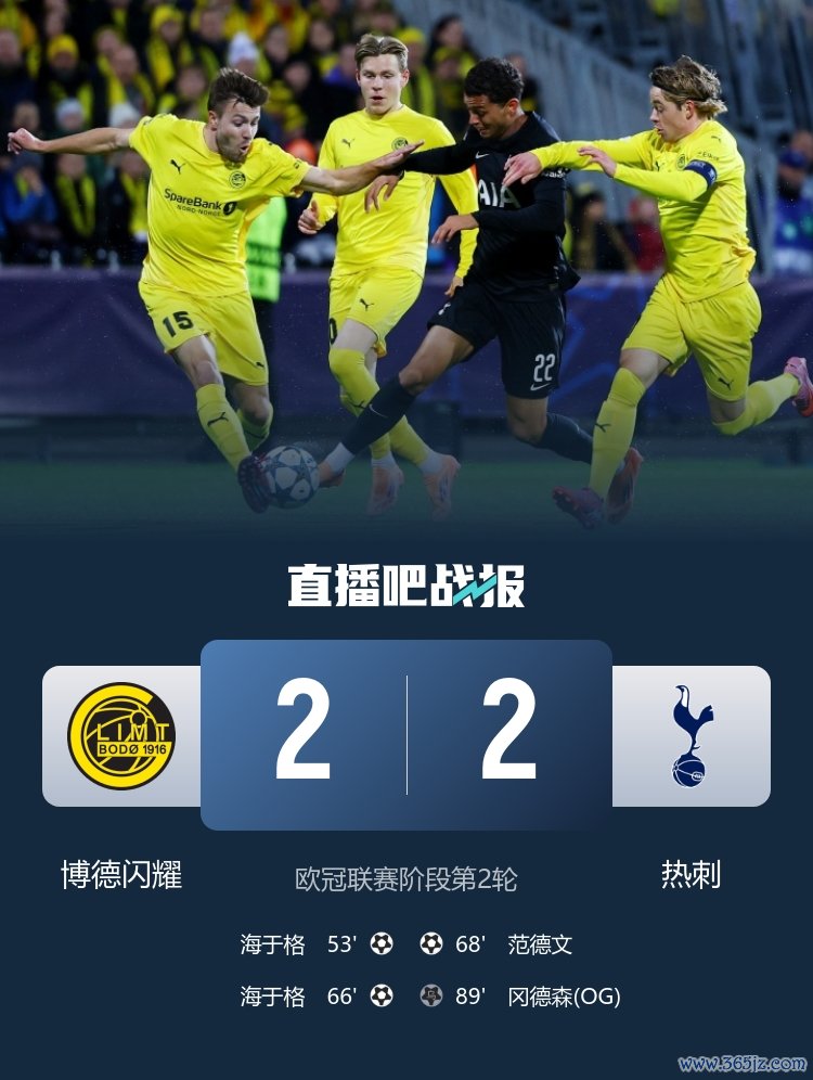 海于格个东谈主秀双响,范德文破门,热刺造乌龙绝平。最终博德耀眼2-2热刺。