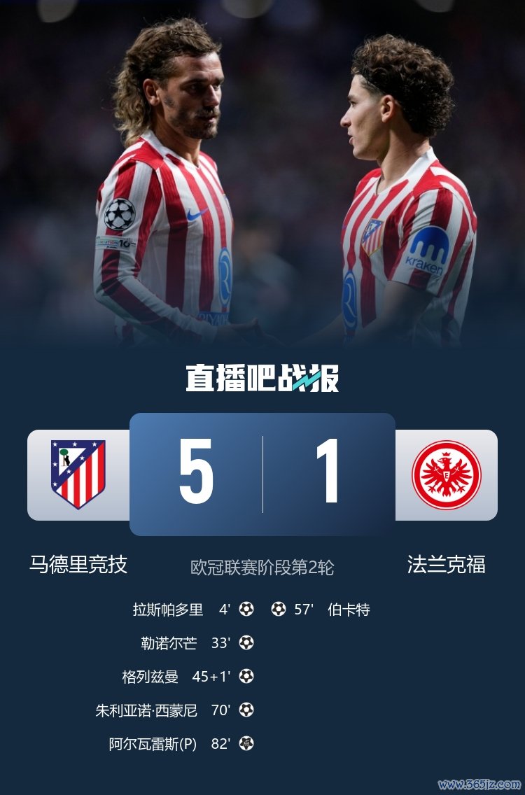 欧冠联赛阶段第2轮,马德里竞技主场5-1大捷法兰克福。马竞获得各赛事3连胜轰13球+团结2场轰进5球+新赛季欧冠首胜。