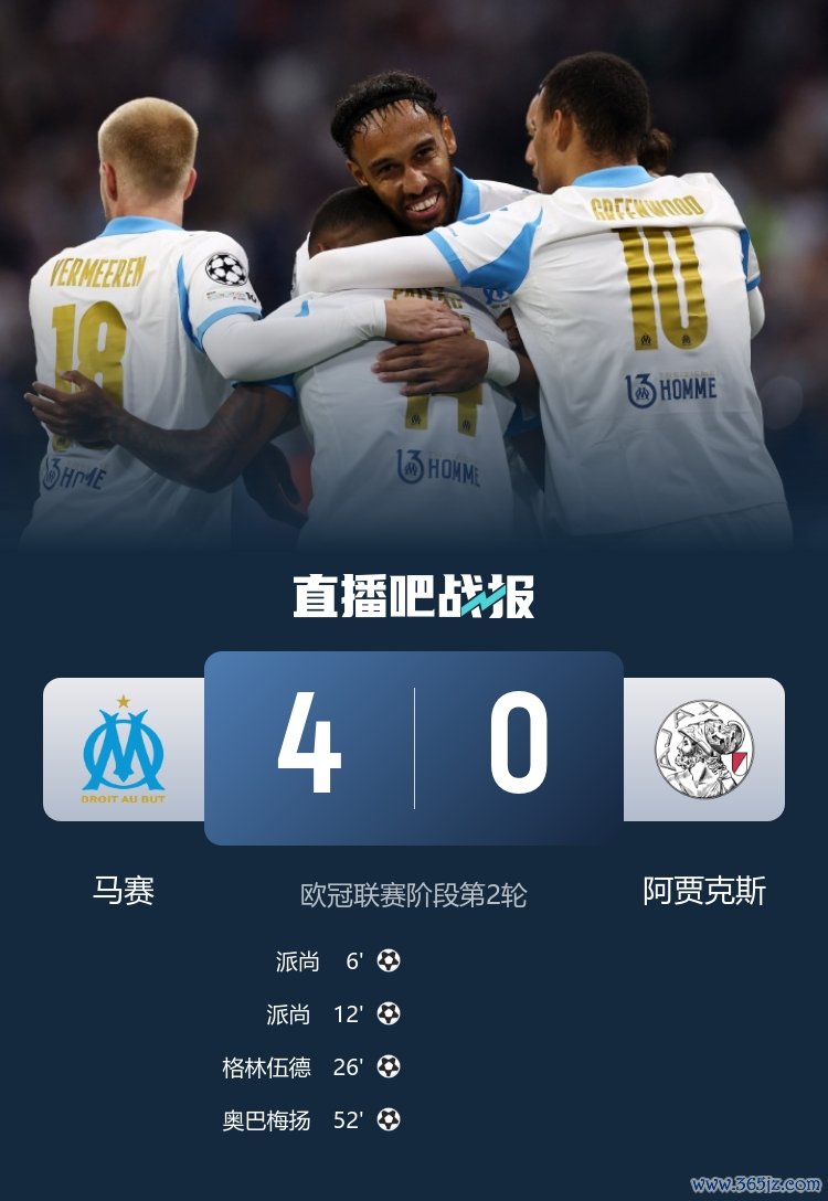 派尚2射1传,格林伍德破门,奥巴梅杨2传1射,最终马赛4-0阿贾克斯获得首胜。