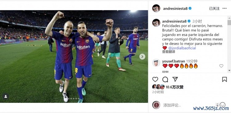 10月8日讯 阿尔巴将在本赛季铁心后退役,老队友伊涅斯塔社媒发文道贺。