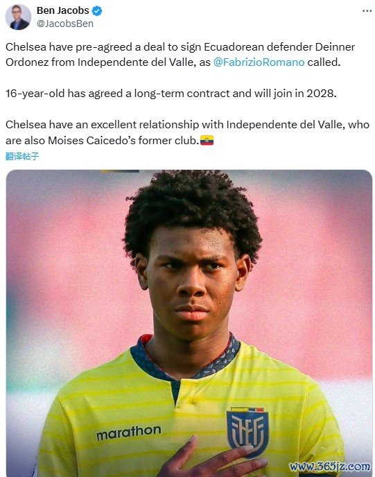 11月15日讯 据记者Ben Jacobs报谈,切尔西预签厄瓜多尔16岁天才后卫奥多涅斯(Deinner Ordonez)终了条约,这名小将如故获取一份遥远合同,他将于2028年1月负责加盟。