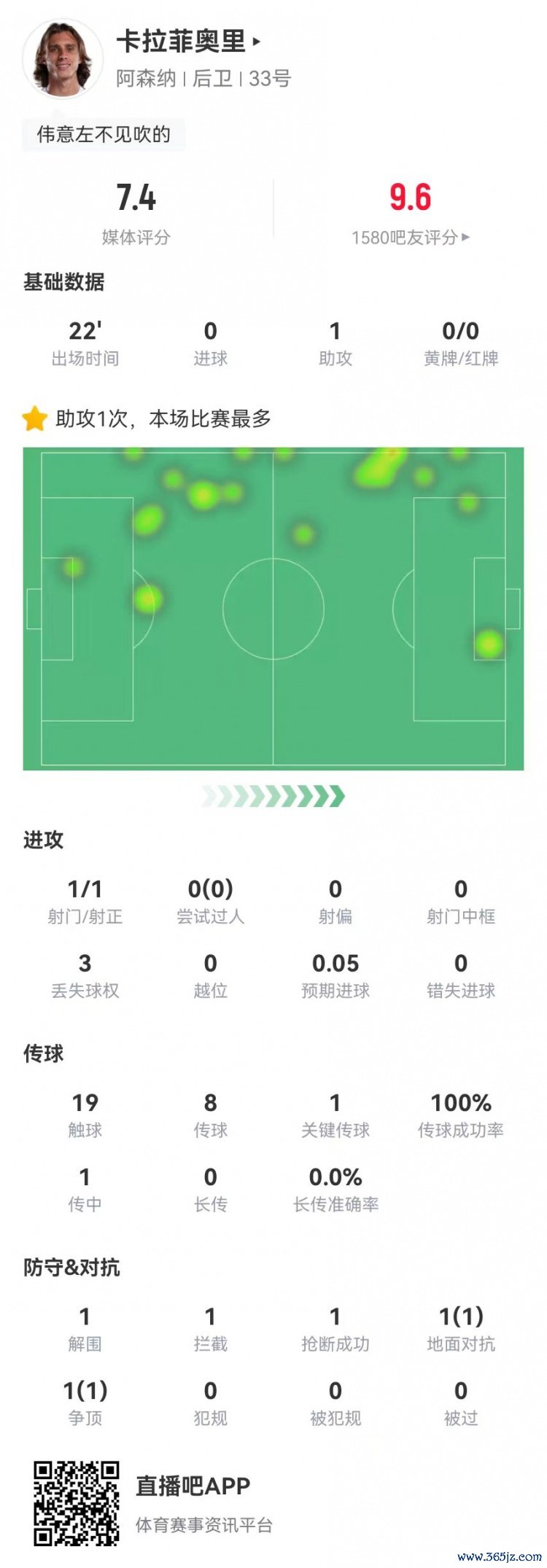 11月27日讯 阿森纳在本轮欧冠3-1力克拜仁,卡拉菲奥里本场数据如下: