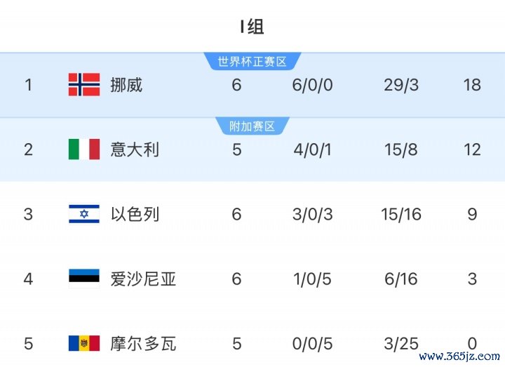 挪威6连胜以18分领跑I组,净胜球高达26个。意大利少赛一场落伍挪威6分,净胜球为7个。