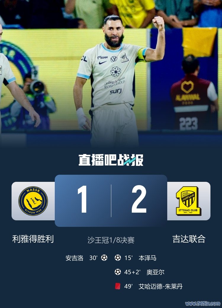 本泽马推射破门,奥亚尔抽射立功,最终利雅得到手1-2十东说念主吉达集结无缘八强。
