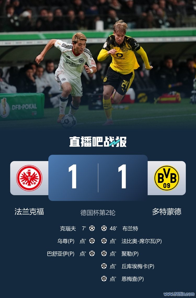 布兰特破门,多脾性球大战5比3法兰克福晋级第三轮。
