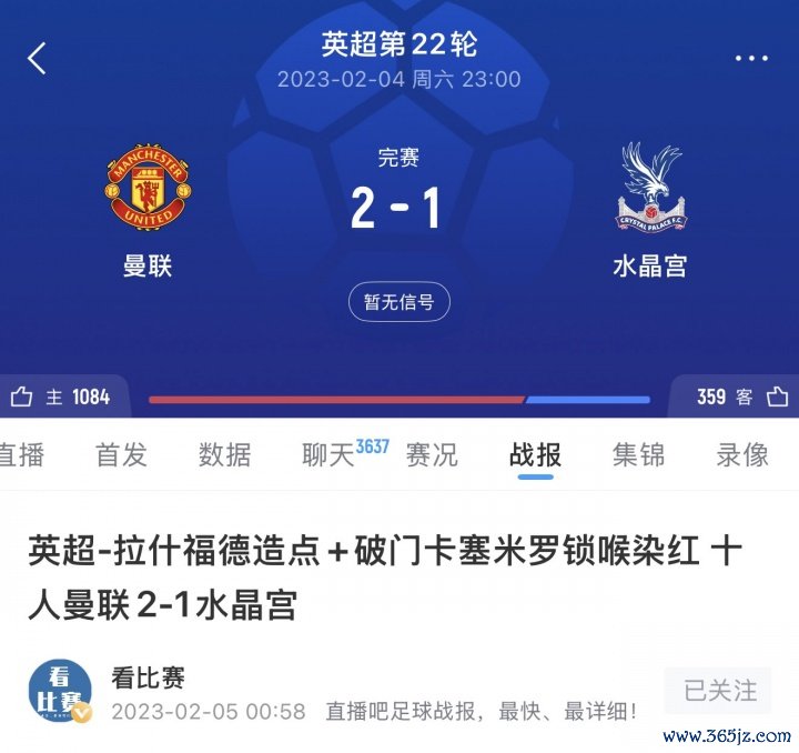 曼联上一次在联赛降服水晶宫的比赛是2023年2月,尔后4场对阵水晶宫1平3负。