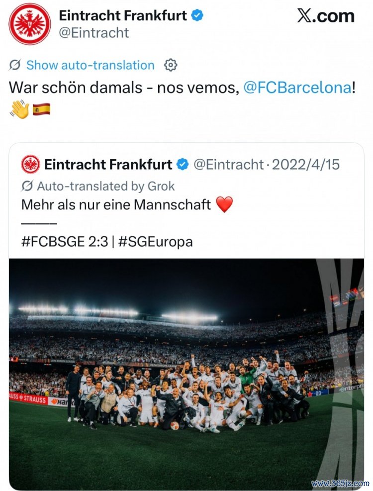 在抽签出炉后,法兰克福官推转发了22年4月,球队在欧联杯1/4决赛次回合客场3-2打败巴萨晋级下一轮的赛后球队合影庆祝告捷的社媒,并配文写谈:“那是一段私密的资历,期待咱们的再次相见,巴萨!”