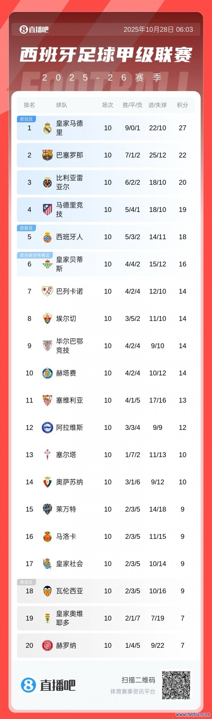 西甲10轮事后积分榜如图: