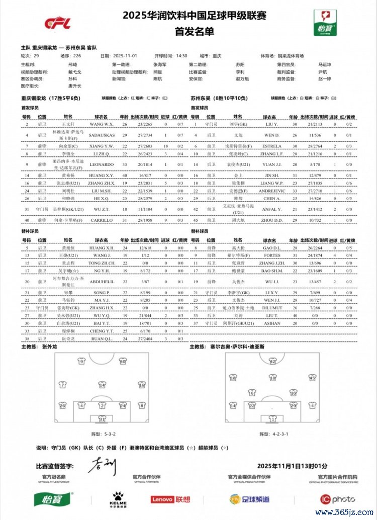 11月1日讯 中甲第29轮,重庆铜梁龙主场对阵苏州东吴。赛前,官方公布了两边的首发名单。
