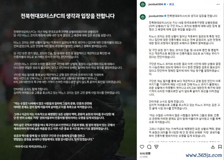 11月25日讯 此前全北当代阿根廷助教拉眼角,被韩国裁判协会禁赛5场,本日全北当代官方发布公告,暗意对这一效果深表缺憾,并将刻毒上诉,同期助教晓示离职,将在赛季摈弃离队。