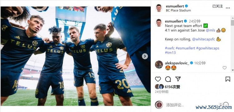 穆勒社媒晒出与队友的合照,配文:“又一场出色的团队弘扬,4-1打败圣何塞。不息前进,温哥华白浪!”