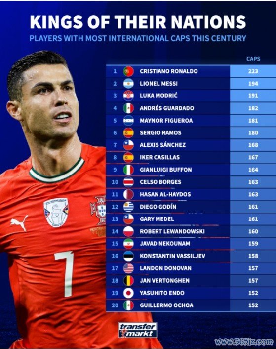 10月10日讯 德国转会阛阓清点了新世纪国度队出场数排名情况,C罗以223场居首,梅西194场次之,莫德里奇191场位居第三。