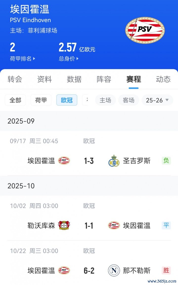 欧冠第二轮,埃因霍温还曾客场与勒沃库森1-1战平,于今三轮的发扬可谓“劫富济贫”。