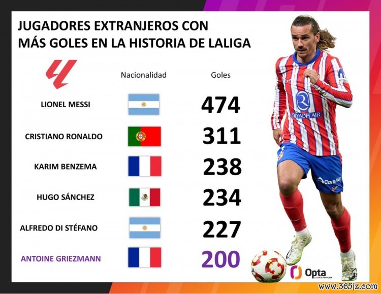 格列兹曼是西甲历史第11位200球先生,同期亦然第6位达此配置的外籍球员。