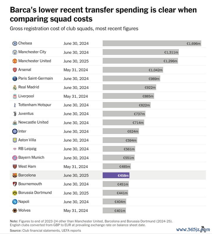 当相比球队成本时,巴萨近期较低的转会支拨了然于目