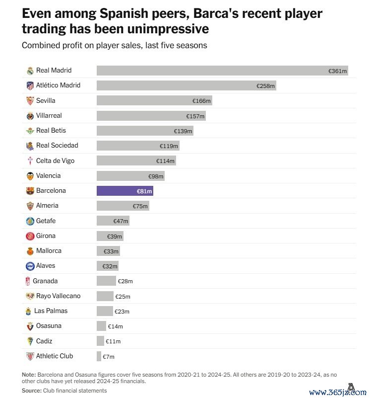 而后卖东说念主收益缩水,即便23/24赛季通过出售登贝莱、凯西和尼科-冈萨雷斯赚钱8060万欧元。以前五赛季球员销售总利润仅8140万欧元,若非21/22赛季对球员价值计提1.6亿欧元减值,数字将更出丑。此利润水平在西甲中游,远落伍于两家马德里俱乐部及欧洲多家敌手。