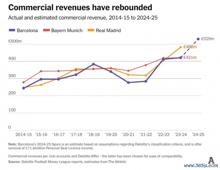 增长仍在延续。巴萨将PSL收入计入生意项,但即便视其为一次性收益剔除,按德勤口径估算,其生意营收可能仍冲破5亿欧元。