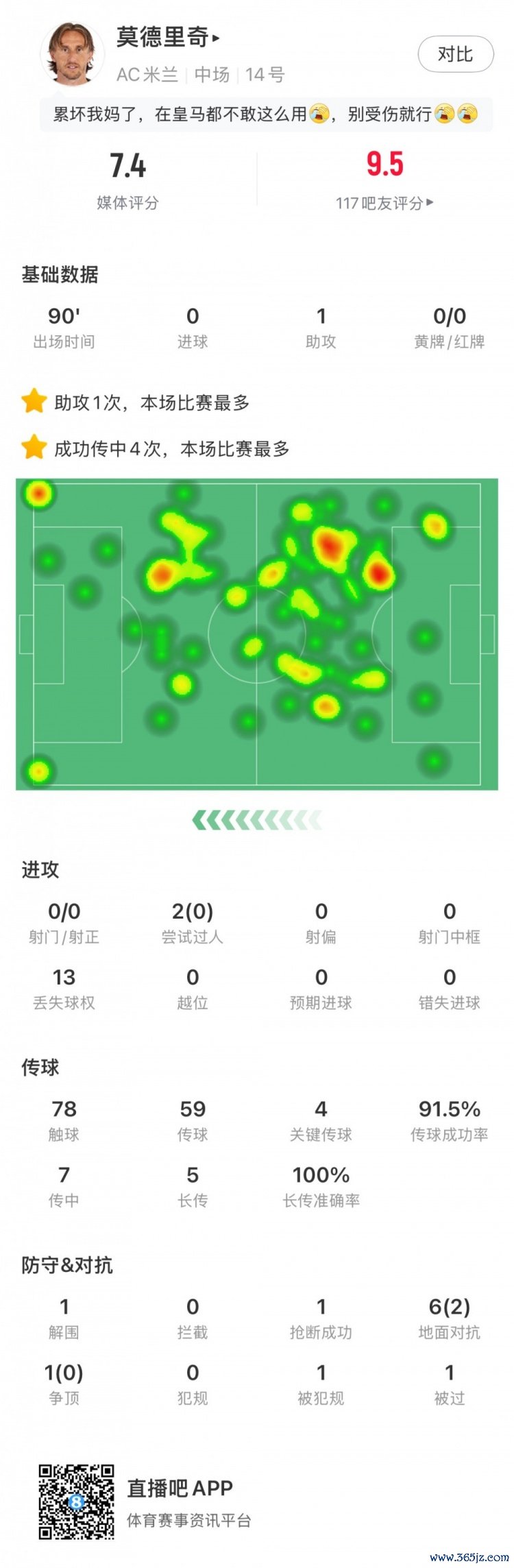 8月30日讯 意甲次轮米兰客场2-0打败莱切,莫德里奇此役首发出战打满全场,比赛数据如下: