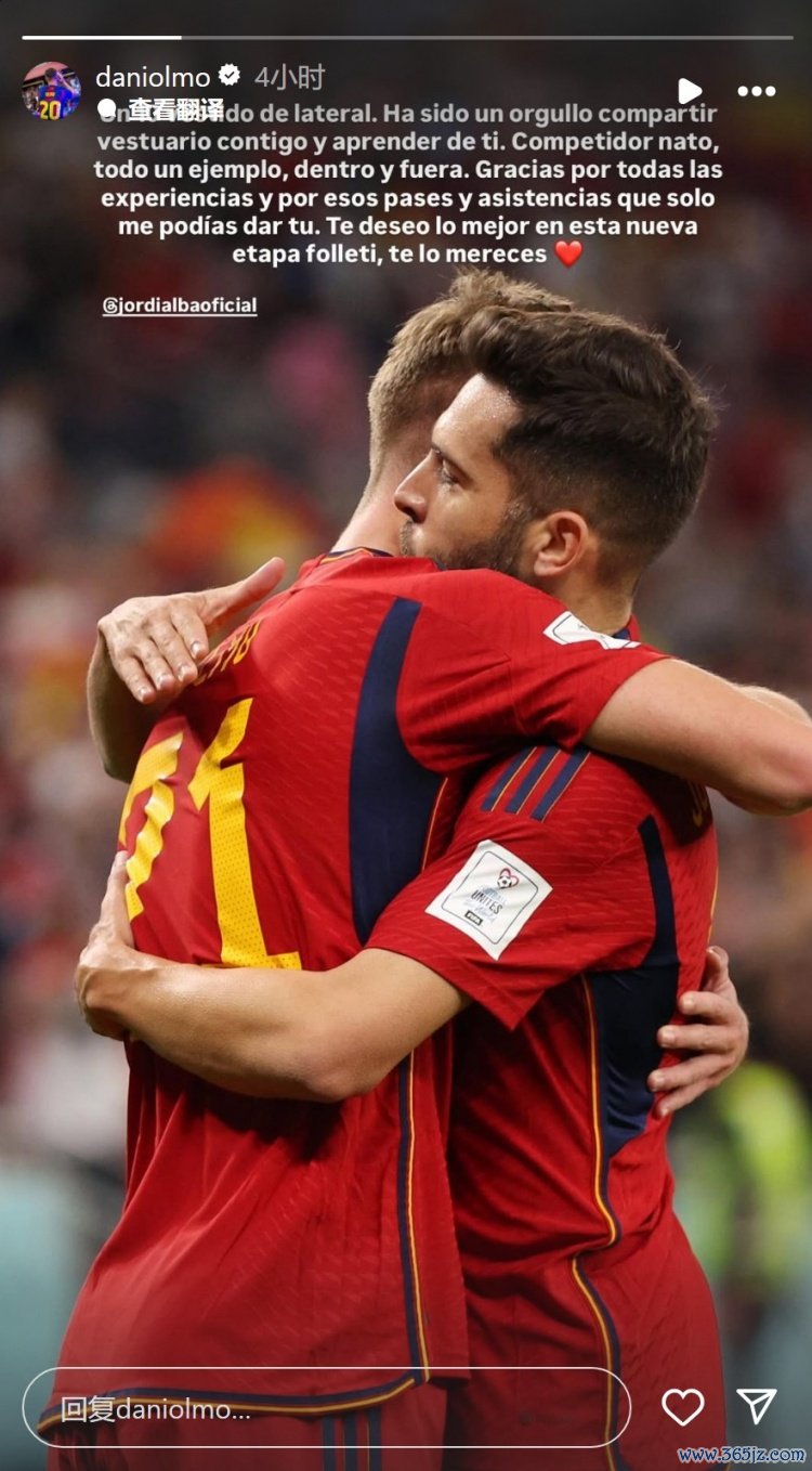 奥尔莫社媒晒出与阿尔巴在西班牙队的合照,配文:“一位10号边后卫。能与你共用更衣室并向你学习,我深感运道。天生的竞争者,场上场下都是楷模。”
