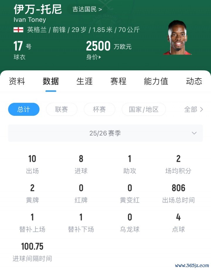 伊万-托尼现年29岁,英格兰时尚,24年8月从布伦特福德以4200万转会至吉达国民。本赛季他为吉达国民各赛事出场10次,获取8粒进球和1次助攻,当今其德回身价为2500万欧。