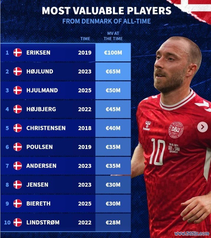 10月13日讯 德转统计了丹麦球员历史身价榜,埃里克森1亿欧位列第一。