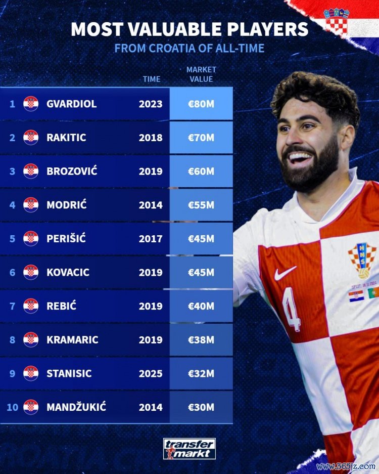 10月13日讯 德国转会商场统计了克罗地亚球员的历史最高身价,并排出克罗地亚球员历史身价名次,格瓦迪奥尔8000万欧居首。