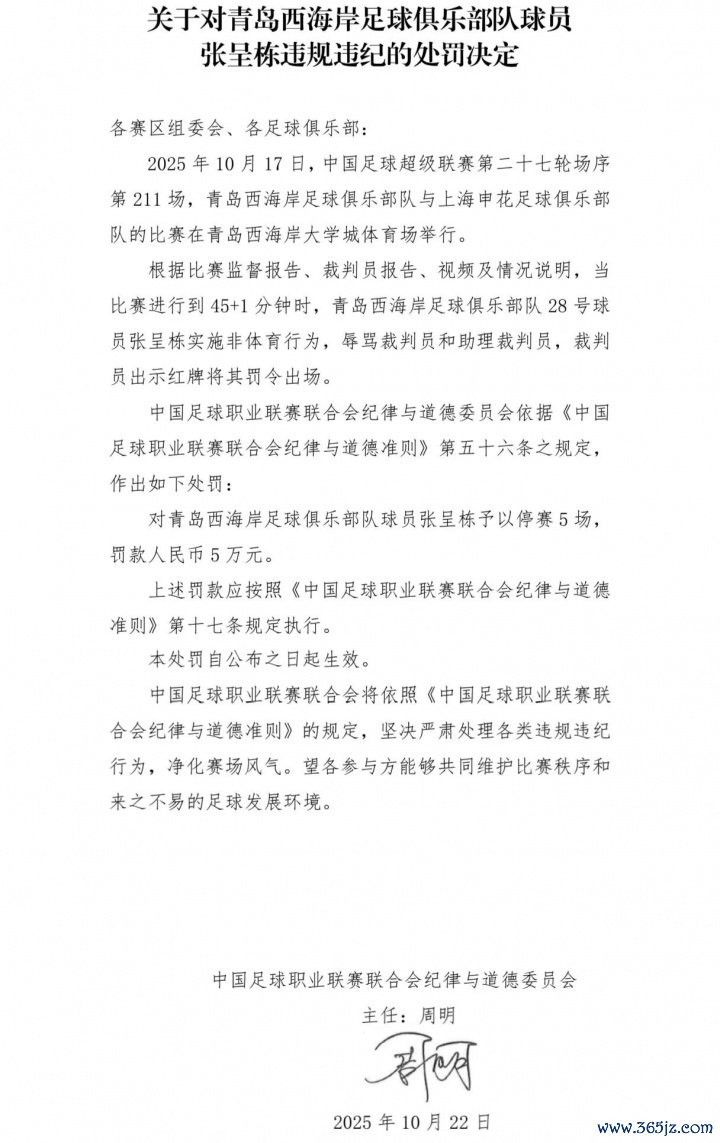 对青岛西海岸足球俱乐戎行球员张呈栋赐与停赛5场,罚金东说念主民币5万元。