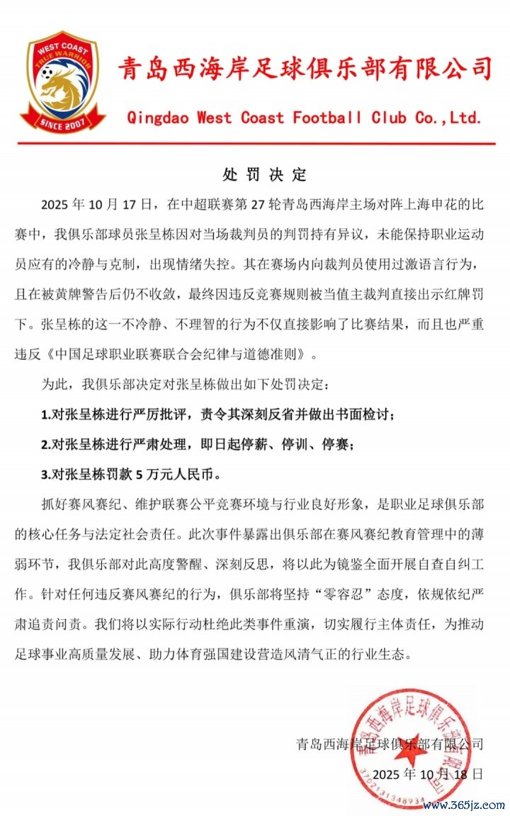 10月18日,青岛西海岸官方发布对张呈栋的处罚决定: