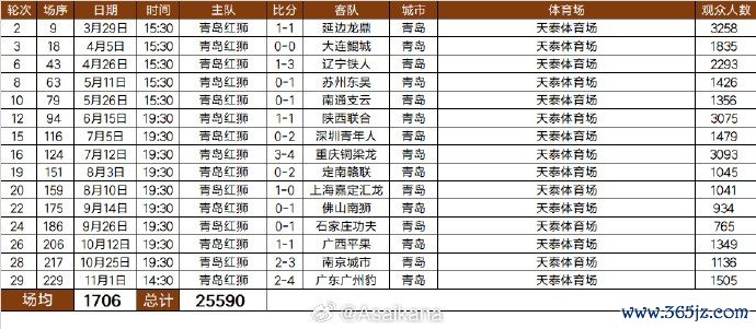 2025中甲联赛青岛红狮队现场不雅世东谈主数统计:共计25590东谈主次,场均1706东谈主。