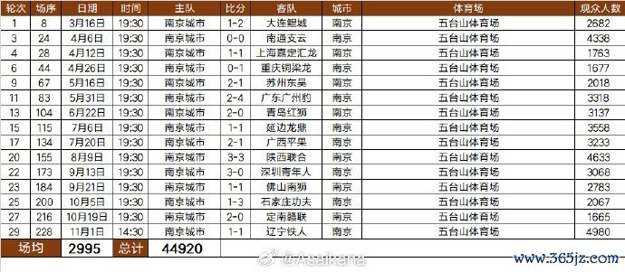 2025中甲联赛南京城市队现场不雅世东谈主数统计:共计44920东谈主次,场均2995东谈主。
